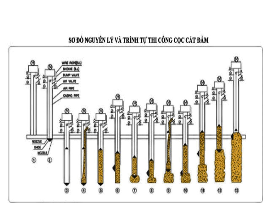 Cọc cát có tác dụng như một giếng cát làm nước ở trong đất chảy ra nhanh chóng thông qua lỗ cát này. Tiến trình nén và độ lún sẽ được làm tăng cao và diễn ra nhanh hơn khi trong giai đoạn xử lý đất. Ông thép được cắm vào đất làm nền móng được nén chặt hơn. Đất được ép chặt hơn trong lúc tạo ra lỗ. Còn nước ở trong đất thì sẽ bị nén cho thoát ra ngoài lỗ đã được nhồi cát.